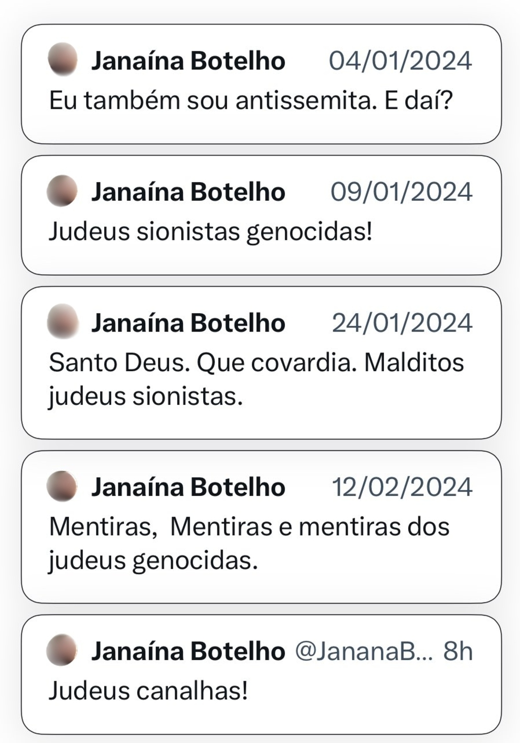 Janaína Botelho é acusada de atacar os judeus em publicações nas redes sociais. Veja uma das postagens abaixo: