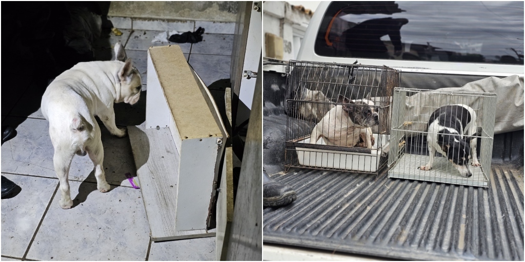 Ainda de acordo com a corporação, diversos cachorros estavam no mesmo cômodo, um deles com lesões que o impediam de andar com as quatro patas, convivendo em meio a fezes e comidas estragadas.